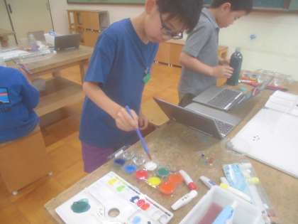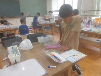 図画工作科「水から発見ここきれい!」では、自由に色水を作り、もようをつくったり、容器にいれたりして、きれいな瞬間を見つけました。絵の具の量や水の量を調整して「きれい!」な瞬間をみつけていました。お家から持ってきてもらった材料も使いました。ご協力ありがとうございました。