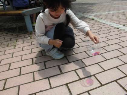 「ひかりのプレゼント」の学習では、透明の容器に色をつけ、光を通してうつった色や形を見つけて楽しみました。