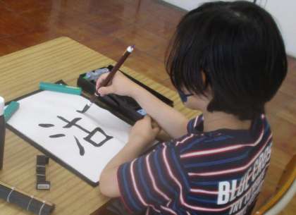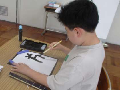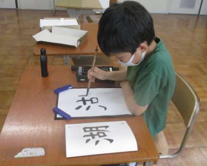 5年生は「道」、6年生は「湖」という字を書きました。画数も多く難しい字ですが、手本をよく見て丁寧に書いていました。