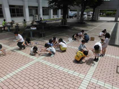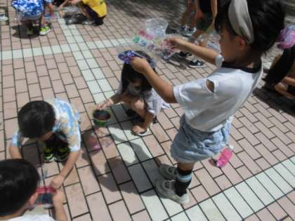 昨日は曇って、交流ができなかったので、今日の晴れ間を狙って、みんなで交流しました。互いに材料に色をぬったものをうつしあったり、重ねたりすると、もっとこうしてみたい!が見つかり、盛り上がりました。