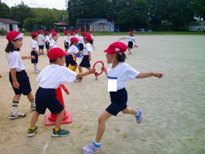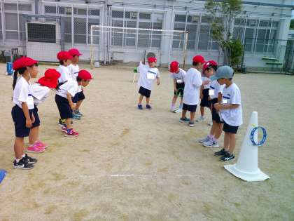はじめてリングバトンも使いました。「ともだちにしっかりわたさないといけないと分かった。」「コーンをちいさく回るといいです。」など、勝つための工夫を振り返っていました。