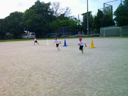 体育でかけっこ・リレー遊びをしています。チームごとに順番を決め、走っています。コーンをくねくねと走る「くねくねリレー」コーンをぐるっと回って走る「ぐるぐるリレー」コーンを折り返してくる「折り返しリレー」をしました。