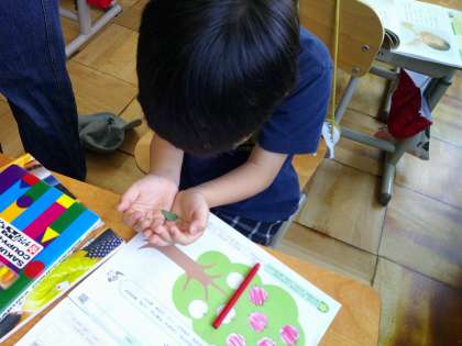 道徳でうまれたてのいのちの学習をしました。出てきたばかりの植物の芽や赤ちゃんの写真などを見るたびに「きれい。」「かわいい。」などよく反応していました。生まれたての命をみたことがあるかを友だちと交流し、りんごに色を塗りました。新たにみつけると、またりんごに色がぬれるので、「うまれたてのいのちをみつけよ。」と話している人もいました。