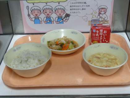 今日の給食は、「牛乳・麦ごはん・豚肉とキャベツのソースいため・トマトと卵のスープ」でした。
