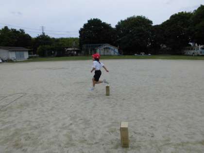 体育の時間に、ぴょんぴょんリレーを行いました。障害物を上手に飛び越えて、走ることができていました。