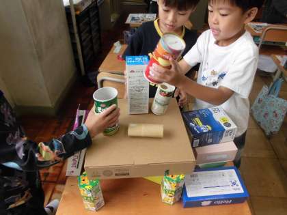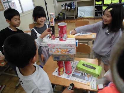 算数で、いろいろな形について勉強しました。四角は四角でも、長かったり平たかったりしていることに気付くことができていました。友達と協力して大きな物も作ることができたね。