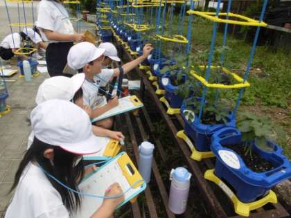 育てている野菜をかんさつし、大きさや形、色などについてメモをとりました。
