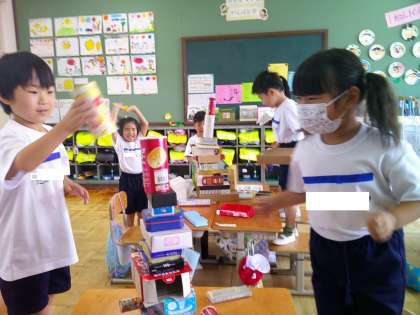 「大きい箱を下にするとたくさん積めるよ。」「(円柱)横にするタイヤのようにころがります。」など気づいたことを話し合いました。