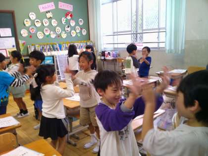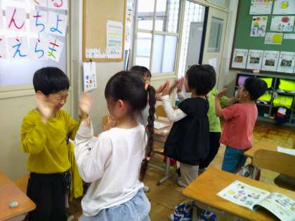 音楽では、拍を意識して楽器や手拍子でリズムをとっています。じゃんけんほんの歌では、じゃんけんも楽しみにしています。