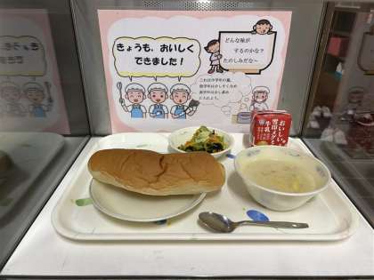 今日の給食は、「味つけコッペパン・牛乳・コーンのクリームシチュー・小松菜のソテー」でした。