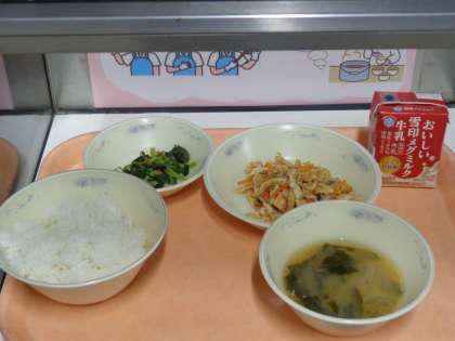 今日の給食は、「ご飯、牛乳,こぎつねちらしの具、大根葉の炒め物、みそ汁」でした。