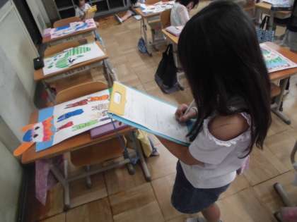 「スイカの中から、スイカ割りをする人が出てくるという発想が面白い。」、「ウサギの形のたまごから、いろいろな色のうさぎが出てきていてかわいい。」、「パスで色を重ねてグラデーションに塗っているのがきれい。」など、友だちの作品のよさを見つけることができていました。