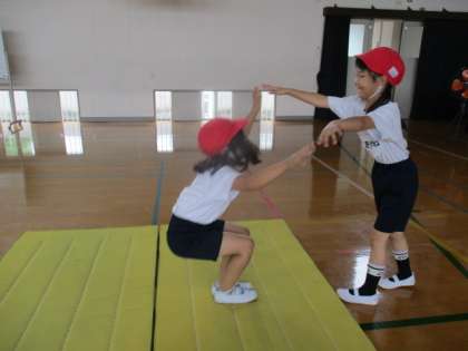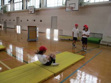 自分のできるいろいろな技を練習しました。できる数がだんだん増えたり、長い時間できるようになってきました。2人組でする技は、友だちと楽しそうにしていました。