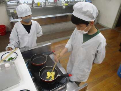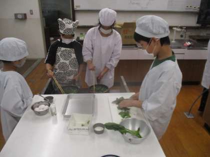 今日は、6年生の調理実習がありました。メニューは、ほうれん草の炒め物とスクランブルエッグです。ほうれん草を包丁で切ったり、卵を炒めたりととても上手にできました。準備や後片付けもグループの友達と協力して活動することができました。