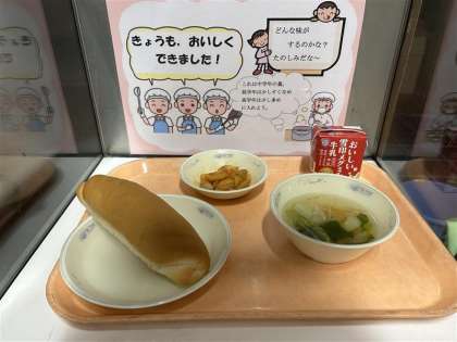 今日の給食は、「コッペパン・牛乳・ソーセージとポテトのケチャップサンドの具・スープ」でした。ソーセージとポテトのケチャップサンドの具は新献立でした。パンを縦や横など自分の好きなように切って、それぞれのサンドイッチを作って楽しんでいました。はさみすぎて具がこぼれないように注意しながら食べていました。