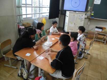 自己紹介をしたあと、6年生が作ったワッペンを受け取ったり、次のたてわりロング昼休みにどんな遊びをしたいかを話し合ったりしました。次の遊びや集合場所を聞いた後は、カードゲームなどをして楽しみました。