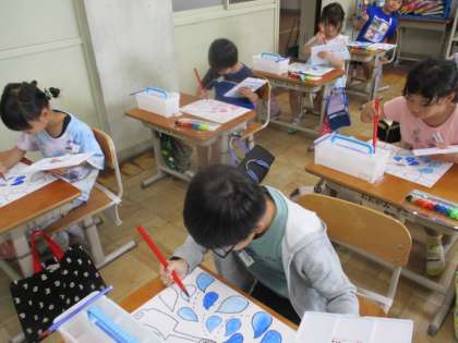 初めて自分の絵の具セットを使いました。使い方を学習し、じょうろから出ている水しぶきに、好きな色を塗りました。そして徐々に水を足して、色の変化を楽しみながら塗っていきました。
