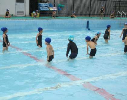 昨日から低水位での低学年の水泳学習が始まりました。大雨が降った日の翌日でしたのでプールの水はまだ少し冷たかったですが、水の中を走ったり、ワニさん歩きやペンギンさん歩きをして楽しく水に慣れることができました。