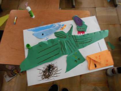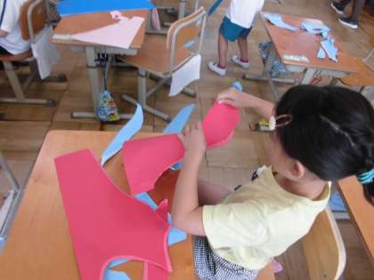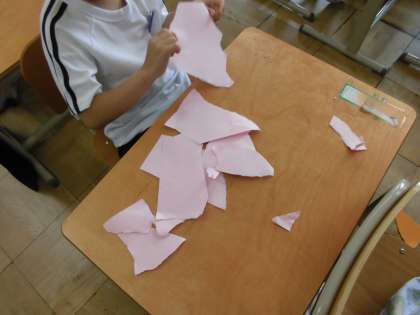 図工の時間に、画用紙をやぶいて「どんな形にみえるかな?」と考えました。たくさんやぶいて「クジラにみえる!」「スイカにもみえる!」とさまざまな見方ができてました。