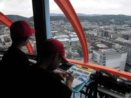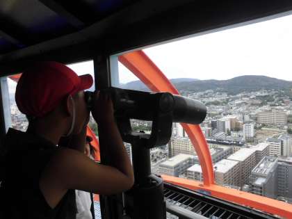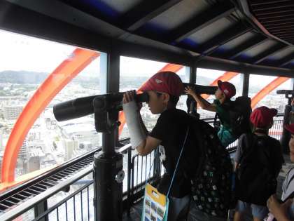 京都タワーの展望台にのぼって、京都市の様子を見ました。東西南北、それぞれの方位に何があるのかをしっかりとメモしていました。双眼鏡でも京都市の様子を見ることができました。