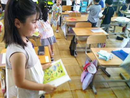 後半は、「学校生活で楽しいことは何ですか?」という質問で交流しました。「ぼくは、体育が好きです。なぜかというと、走るのが楽しいからです。」「私は、図工が好きです。物を作るのが好きだからです。」など自分の好きな学習について理由も添えて話すことができました。