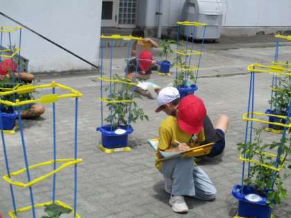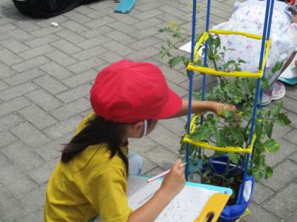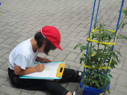 自分が育てている野菜の観察をしました。前の観察の時よりずいぶん成長し、花が咲いたり、実ができたりしていました。