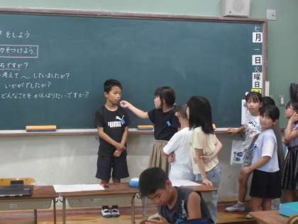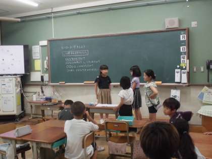 グループでのインタビューの後、学級全体で「水泳ヒーロー」と、「宿題花丸ヒーロー」が代表になって、立候補した記者がインタビューしてくれました。