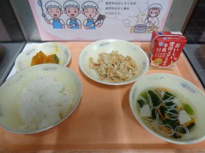 今日の給食は、「牛乳・ご飯・きつねどんぶりの具・かぼちゃの煮つけ・七夕そうめん」