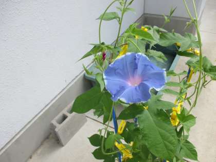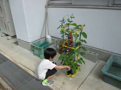 1年生が毎日一生懸命に水をあげて育てた朝顔の花が咲きました。きれいな青紫の花を見ると「すごーい!」と喜びの声をあげていました。暑さに負けない朝顔。これからどんどん咲いてほしいですね。