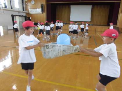 テーマは「協力」です。グループでフラフープのくぐりぬけをしたり、輪になって座り、落とさないように風船バレーをしたり、2人組で新聞紙を使って風船を運んだりしました。