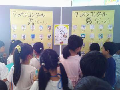 児童会の校内オリエンテーリングのグループの印にもなっているワッペン。そのコンクールが行われており、1年生も投票しにいきました。自分のグループを選んでいる子や気に入った絵を選んでいました。