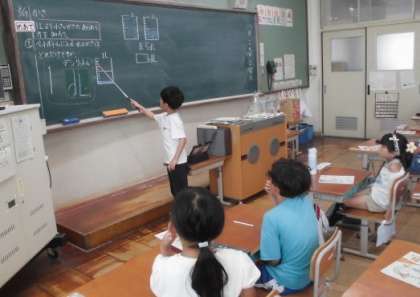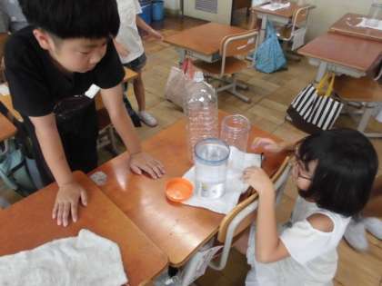 算数科「かさ」の学習で、1Lよりも小さいかさの表し方を学習しました。そして、身の回りにある容器の水のかさを調べてみました。