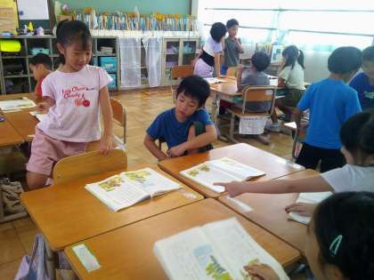 おむすびころりんの音読発表会をしました。おじいさんのようすがよく分かるように動作を入れたり、声の調子を変えたりして音読しました。