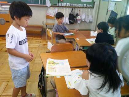 おじいさんがおどっているところや足をすべらせたところ、まてまてまてとおむすびをおいかけているところなど表現豊かに音読していました。