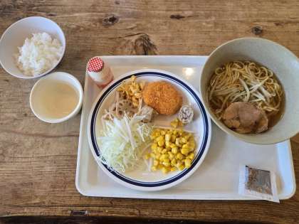 今日のメインメニューは、醤油ラーメンでした。おかわり自由のバイキングもあります。ハイキングでいっぱい体を動かしたので、みんなもりもり食べています。