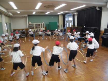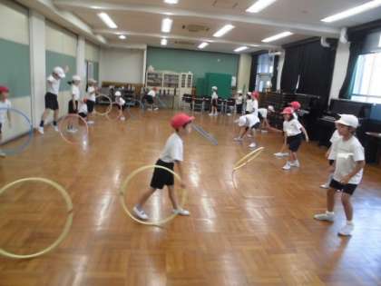 体育の「ようぐあそび」の学習では、フープを使っていろいろなあそび方を楽しみました。