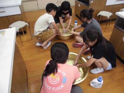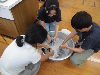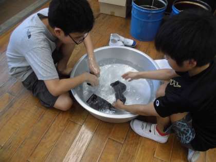 手洗いで、くつ下の洗濯をしました。洗剤液をつくり、もみ洗いやつまみ洗いをし、すすいで干しました。普段はお家の人に洗濯をしてもらうことが多いようですが、この実習を機にお家でも活躍してほしいと思います。
