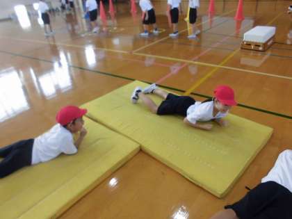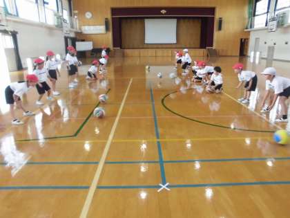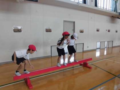 体育の時間にまねっこ遊びとボール遊びをしました。まねっこ遊びでは、新しく平均台やマットを使って自分たちで動きを考えました。ボール遊びでは、ボールを相手に向かって転がすことを頑張ってました。