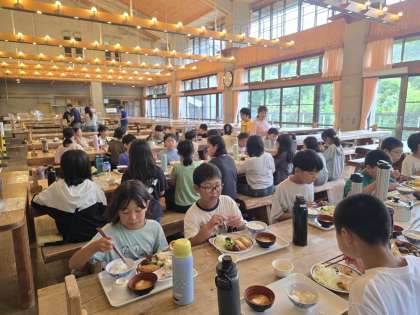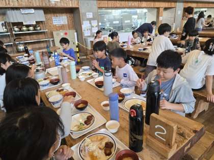 夕食タイムです。今日はたくさん体を動かしたので、よっぽどおなかがすいていたのか、たくさんの子たちがおかわりをしていました。おいしかったね!!