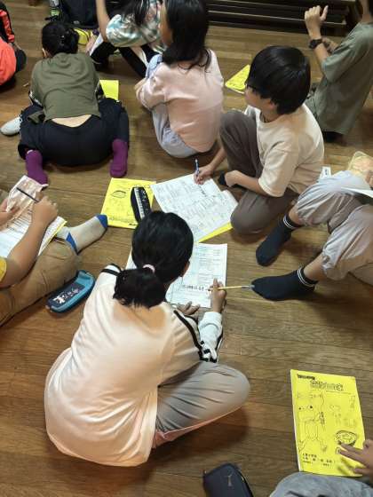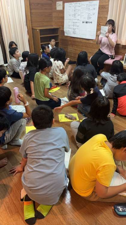 楽しかったキャンプファイヤーも終わり、2日目のふり返りタイムです。山の家も後1日。みんなで明日の目標を確認しています。この後、就寝準備をします。