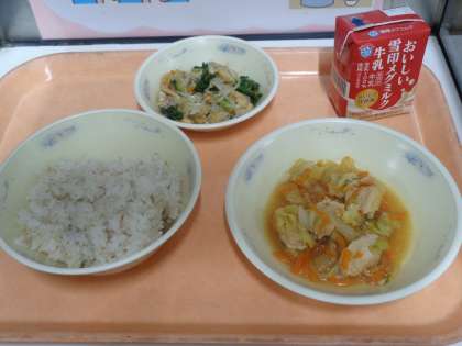 今日の給食は「麦ごはん、けいちゃん、もやしの煮びたし、牛乳」でした。みその香りのする甘辛いたれをからめたけいちゃんはごはんとの相性も良く、食器を返しに来た給食当番さんも「今日の給食最高!けいちゃん美味しかった!」と言ってくれました。