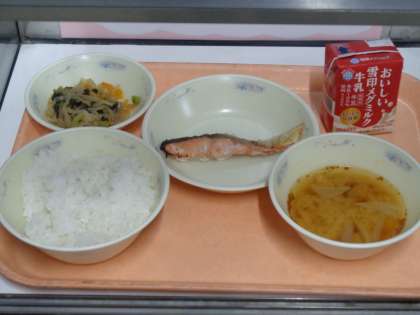 今日の給食は、「ごはん、牛乳、鮭の塩麹焼き、小松菜と切り干し大根の煮びたし、かぼちゃのみそ汁」でした。