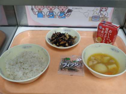 今日の給食は、「麦ごはん・牛乳・鶏肉と野菜の煮つけ・ひじき豆・じゃこ」でした。