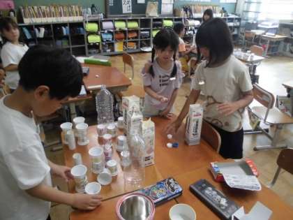 生活「あそんで作ってくふうして」では、集めてきた物を使って、どんなあそびができるのかを考えました。