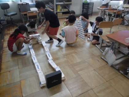 「もっとこうしてみる。」「ここにこれを積んだらいいんちゃう?」「もっと高くしよう。」などと新たな考えが出てきて、どんどん楽しい遊びになっていきました。