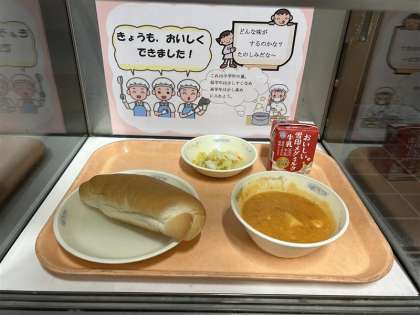 今日の給食は、「コッペパン・牛乳・トマトクリームシチュー・野菜のソテー」でした。