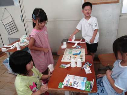 9月8日、廃材の中から、牛乳パックや紙コップ、輪ゴムを使った跳ぶおもちゃの仕組みを知り、作って遊んでみました。