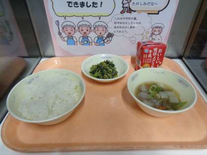 今日の給食は、「ごはん・牛乳・いも煮・だいこん葉とじゃこのいためもの」でした。
