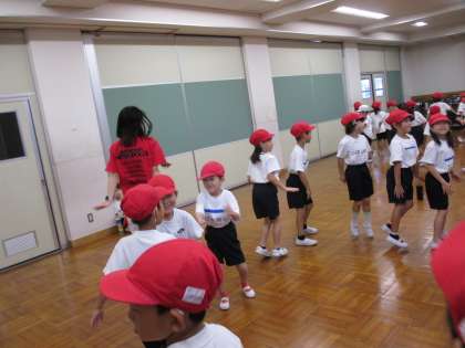 交流学年でフォークダンスの練習をしました。軽快な音楽にのって右に回ったり左に回ったり,「ヤクシー!」という掛け声をみんなで元気にかけて楽しく踊りました。