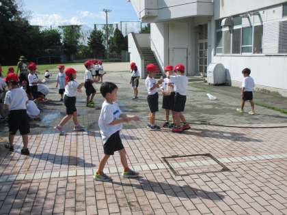 交流学年の友達と一緒に楽しく水遊びをすることができました。今日も暑い日だったので、とても楽しくできました。遠くまで水を飛ばそうと一生懸命に考えていました。